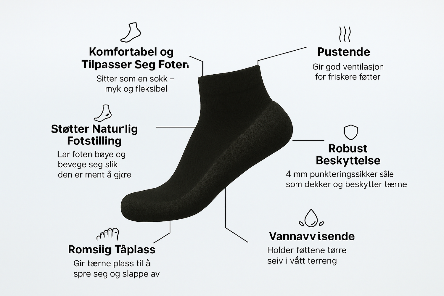 Er det ikke deilig å gå med sokker på føttene? Tenk om du kunne kjenne den samme komforten overalt. Vår barfotsko gir deg god komfort, beskyttelse og passer til alt.